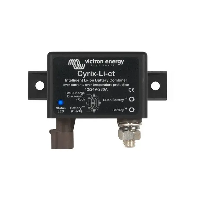 El Cyrix-ct 120A es un relé inteligente de alta resistencia controlado por microprocesador que conecta automáticamente las baterías en paralelo cuando una de ellas alcanza una tensión preestablecida (carga) y las desconecta cuando la tensión baja (descarga). El Cyrix-ct es la alternativa perfecta sin caídas de tensión a los aisladores de diodo.